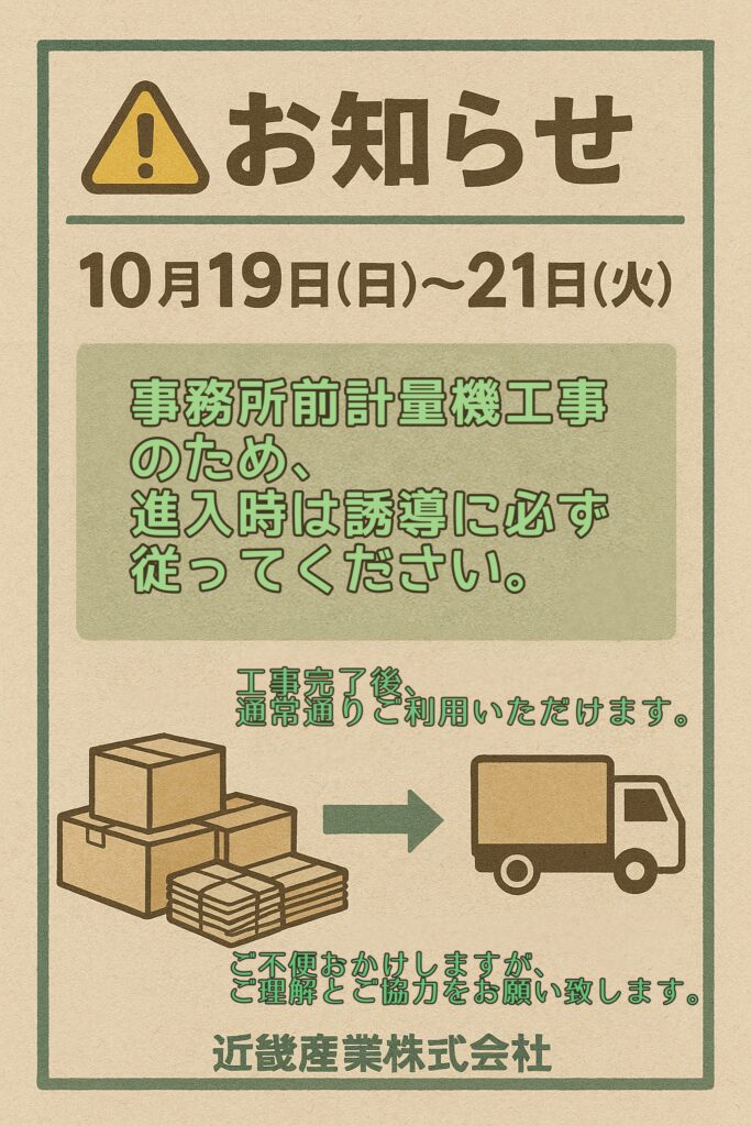 誠に勝手ながら、事務所前計量機の工事についてお知らせします。