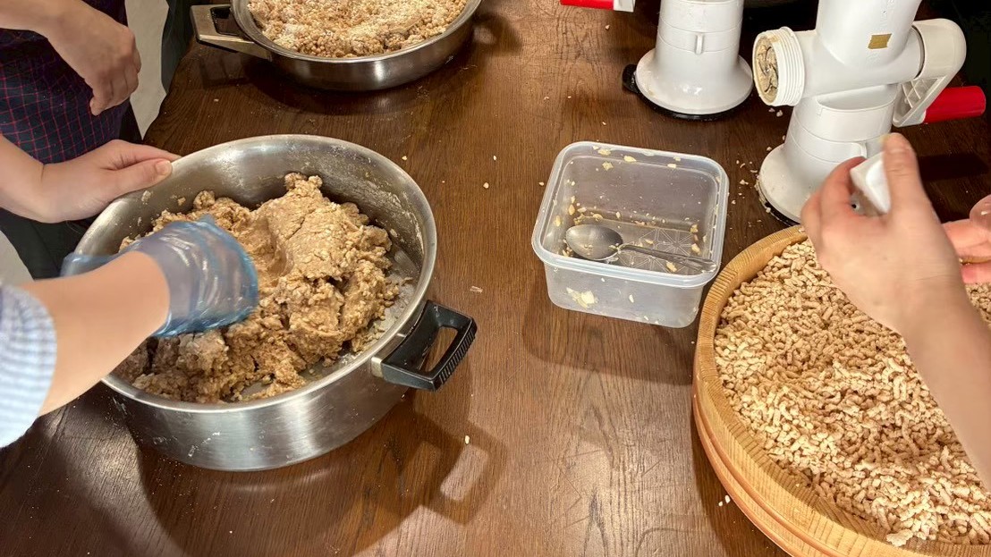 煮た大豆を潰し、麹と塩を合わせて仕込んでいきます。